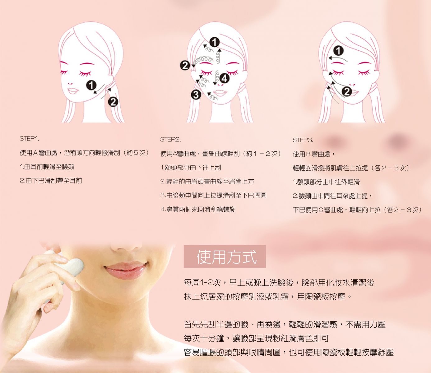 一星期1~2次,早上或晚上洗臉後,用化妝水清潔,抹上市售的按摩乳膏,用陶瓷板按摩。